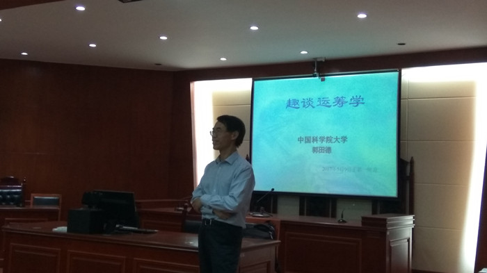 5月9日下午,应我校邀请,中国科学院大学郭田德教授在我校数学与计算科学学院作了题为“趣谈运筹学”的学术讲座。讲座由数学与计算科学学院副院长欧阳章东主持,数学与计算科学学院师生150余人聆听了讲座。