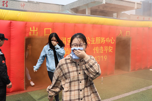 活动分为模拟火灾现场逃生演练和医疗救护常识两个部分。上午8时,模拟火灾现场逃生演练正式开始。活动工作人员首先为大家讲解了模拟逃生器材的使用及注意事项,要求进入浓烟区时弯腰低头,左手用湿毛巾捂口鼻,右手扶墙壁依次通行。在工作人员的指导下,我校师生有序进入演练区域,体验火灾逃生场景,顺利完成了逃生演练活动。随后,在学校体育馆进行了心肺复苏培训,工作人员教授了拍打双肩、观察生命体征、判断呼吸心跳、胸外按压、人工呼吸这一完整的急救过程。