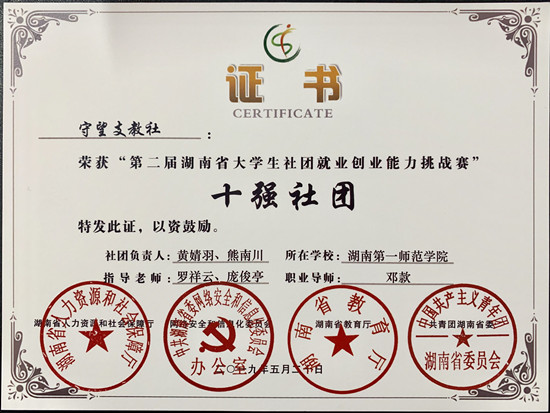 近日,在湖南省人社厅、网信办、教育厅、团省委主办的第二届湖南省大学生社团就业创业能力挑战赛中,我校学生社团守望支教社携带就业创业项目“智慧乡村教师成长app”经过初赛、半决赛、总决赛层层筛选与实战比拼,从全省高校近2000个参赛学生社团中脱颖而出,获得十强社团的优异成绩。