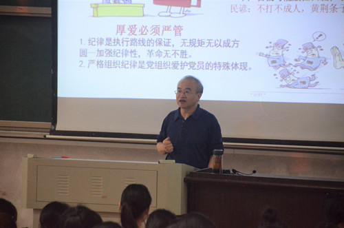 5月23日晚6点10分至9点40分,校党委书记彭小奇教授先后在怀中楼南栋208、108教室作了“厚爱必须严管——关于全面加强党的纪律建设”专题讲座,拉开了我校2019年度春季形势与政策课专题讲座的序幕,近千名学生参加了此次别开生面的专题教育。教务处副处长温群雄、马克思主义学院院长周小李到现场观摩。