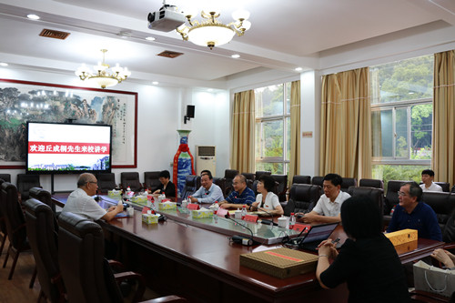 在讲座前,丘成桐教授听取了彭小奇书记对学校的整体发展情况介绍。丘成桐表示,农村需要优秀的小学教师,乡村小学教师的培养很有意义,将尽力支持学校的发展。会后,丘成桐教授与我校数学与计算科学学院的教师代表进行了交流。下午,丘成桐教授还到城南书院校区参观了毛泽东与第一师范纪念馆。