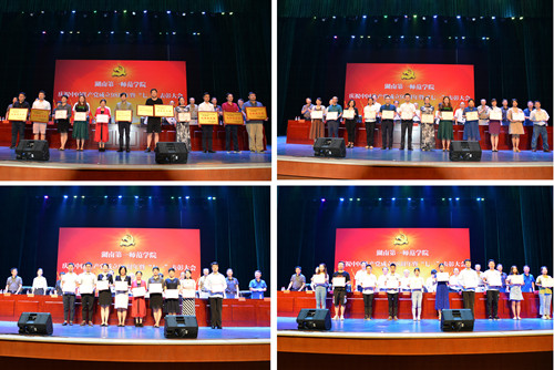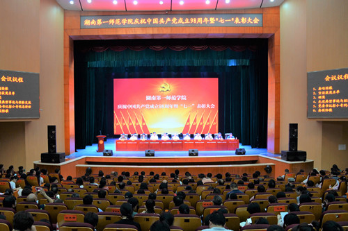 7月1日下午,我校在田汉剧场隆重召开庆祝中国共产党成立98周年暨“七一”表彰大会。全体校领导、所有在职教师党员、离退休党总支党员代表、两所附小的党员代表和学生党员近千人参加大会。会议由校党委副书记刘志敏主持。