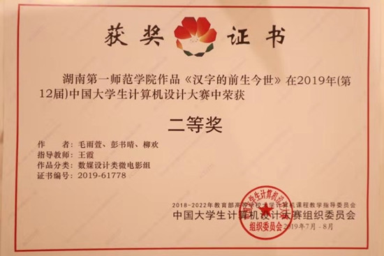 近日,第12届中国大学生计算机设计大赛数媒电影类决赛在浙江音乐学院落下帷幕,我校美术与设计学院小学教育美术专业学生毛雨萱、彭书晴、柳欢在文学与新闻传播学院王霞老师的指导下,以中华民族的文化符号汉字为主题摄制微电影《汉字的前世今生》,创造性地融合了3D幻灯片、三维动画效果等视频形式,打破了传统的线性叙事空间,生动形象地展现了汉字的演变历程,获大赛数媒设计类微电影组二等奖。该项赛事是由教育部大学计算机课程教学指导委员会中国大学生计算机设计大赛组织委员会主办,在吉林大学、北京大学等高校相继展开。