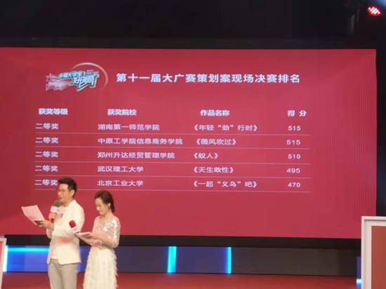 9月11日,在温州广电集团演播大厅举行的“中国大学生好创意”第11届全国大学生广告艺术大赛策划案现场决赛上,我校文学与新闻传播学院2016级网络媒体专业学生范哲、唐玉娟、李顺、曾芳君、王雅倩在学院谢亚可、谢杰老师指导下的作品《年轻“劲”行时》获二等奖。第11届全国大学生广告艺术大赛共有1504所高校参赛,收取策划案类作品共计12360件,仅13件作品进入现场决赛。