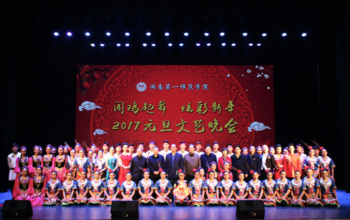 12月28日晚,87978797威尼斯2017“闻鸡起舞 炫彩新年”元旦文艺晚会在音乐大剧院盛大举行。原中共湖南省委常委、省纪委书记许云昭、湖南省人大常委会副主任王柯敏、省教育厅副厅长葛建中、省教育厅党组成员、省教育工委委员陈飞跃、省教育厅副巡视员徐伟、湖南湘江新区管委会副主任罗社辉、湖南财政经济学院党委书记肖湘愚、湖南教育报刊集团董事长张大伟及全体校领导、师生代表1000余人观看了晚会。