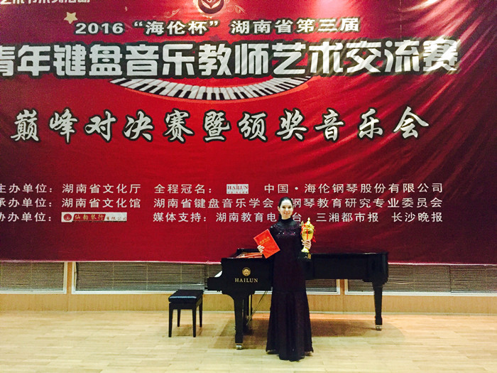 12月22日,2016“海伦杯”湖南省第三届青年键盘音乐教师艺术交流赛巅峰对决赛在湖南音乐厅举行,我校音乐舞蹈学院钢琴外籍教师、俄罗斯青年钢琴家Natalya捧得冠军奖杯。