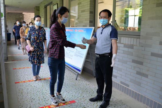 学生佩戴口罩进入教学楼,间隔1米距离,依次到达教室门口测量体温。任课教师佩戴口罩站在1米开外,提醒学生们有序进入教室,在贴有姓名贴的课桌就座,检查教室门窗是否全部打开,并询问同学们是否有人感到不适,交代同学们上课期间的注意事项。