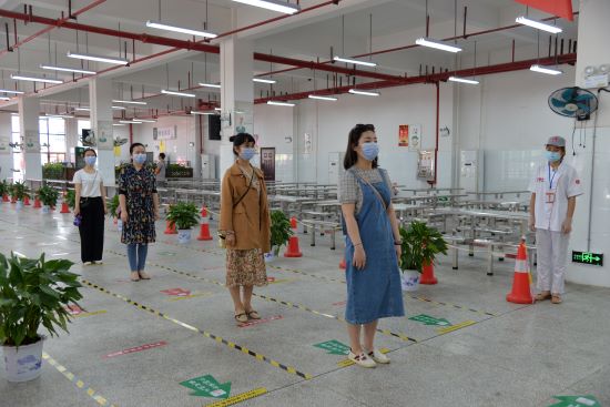 在食堂外戴口罩洗手后,按照分流指示牌要求,排队进入餐厅。师生到指定窗口排队(间距为1米以上)取餐,并在指定区域就餐。就餐时同向而坐,不面对面交谈,就餐完毕立即戴上口罩,将餐具送到指定回收处,迅速离开餐厅,食堂工作人员立即清扫用餐桌椅并消毒。食堂人员工作中与服务对象保持1米以上安全距离。三餐之间,食堂对全部餐具和就餐环境进行消毒。