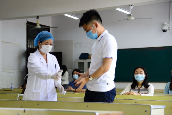 返校当天,学生佩戴口罩,排队保持1米以上间距进入校园。在校门口,工作人员喷洒医用酒精为学生进行手部消毒,核验学生身份证、校园卡或学生证,并进行体温测量,确认体温正常方可入校。学生将返校途中所戴口罩放入专用回收桶。进入学校后,学生径直来到校门口后广场,将返校前一天电子健康卡(绿码)及返校前21天行踪与健康情况报告卡递交给其所在学院辅导员,并更换佩戴新口罩。