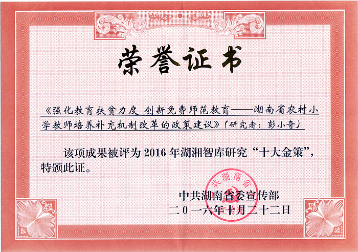 经推选报送、成果初审、网络互动、专家打分、媒体公示等程序和环节,报经省委领导同意,我校的《强化教育扶贫力度创新免费师范教育——湖南省农村小学教师培养补充机制改革的政策建议》智库成果入选“十大金策”。
