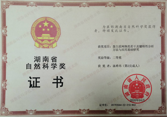 汤希玮教授喜获2019年度湖南省自然科学奖二等奖