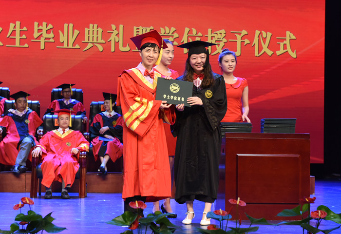 在激昂的校歌声中,怀着无比激动的心情,毕业生身着学士服依次登台,迎接人生中这一庄严而神圣的时刻。校学位评定委员会主席、校长童小娇与他们一一握手祝贺,颁授学位证书并合影留念。从校长手中接过烫金的学位证书,激动洋溢在每一张年轻的脸庞上。他们深情地向导师鞠躬致谢,与台下迎候的亲友拥抱庆祝,难忘的四年求学历程终于划上了圆满的句号。