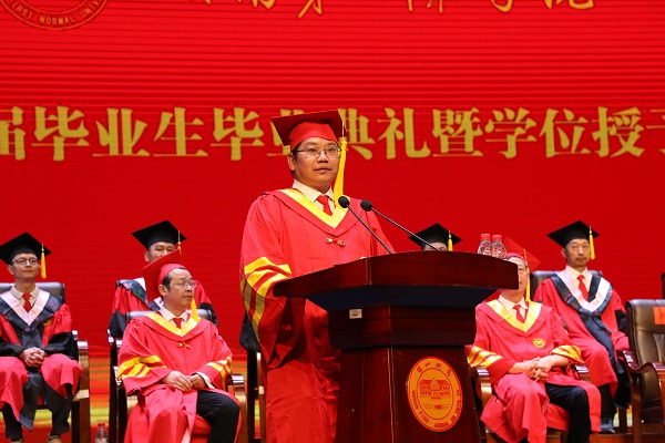 教育科学学院李金国教授作为教师代表发言,向毕业生表达祝贺,勉励全体毕业生终身学习,独立思考,不断开阔眼界,继续秉持“实事求是,不自以为是”校风,迎接崭新未来。文学与新闻传播学院的刘桂山同学代表毕业生发言,号召全体毕业生谨遵母校的教诲,虔诚学习,认真生活,让母校以大家为荣。
