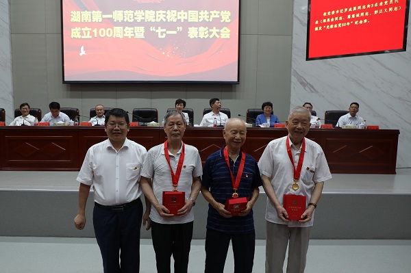 随后,受到表彰的集体和个人上台领奖。校党委书记罗成翼向3名老党员代表颁发了“光荣在党50年”纪念章。