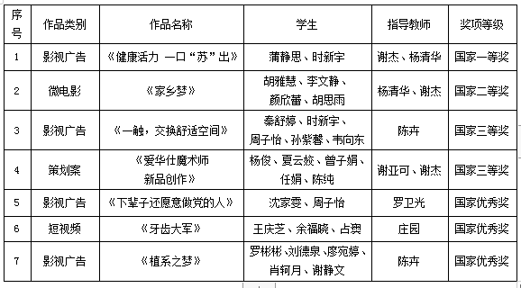 9月17日,在刚刚落下帷幕的全国大学生广告艺术大赛中,由我校文学与新闻传播学院谢杰、杨清华老师指导,蒲静思、时新宇同学创作的《健康活力 一口“苏”出》获得大学生广告艺术大赛全国一等奖。此次大赛我校共有七组师生作品获奖,其中国家一等奖1项,二等奖1项,三等奖2项,优秀奖3项。