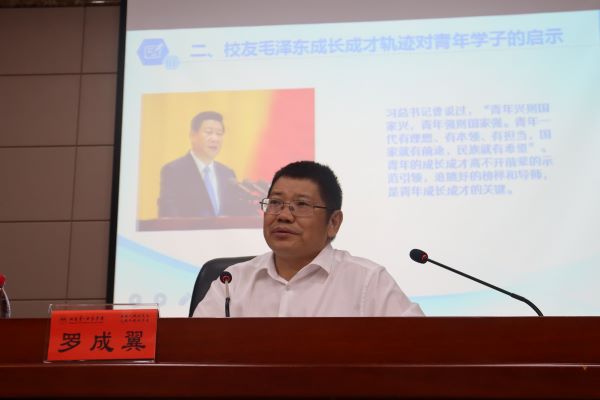 罗成翼从学校历史沿革、毛主席求学一师的小故事、百年师范的今天与未来以及当代一师学子如何守初心担使命等四个方面开讲。他首先向同学们介绍了学校的历史沿革、优良的教育传统和光荣的革命传统,让同学们真切的感受到了“千年学府,百年师范”的深厚底蕴。接着通过分享毛主席在一师求学期间的四个故事讲述了毛主席的优秀品质及带给青年学子的启示。罗成翼强调,同学们要向毛主席一样要立鸿鹄之志,有家国情怀;要自律好问,言谈有矩;既读“有字之书”,又读“无字之书”,注重实践;要“文明其精神,野蛮其体魄”,注重锻炼。