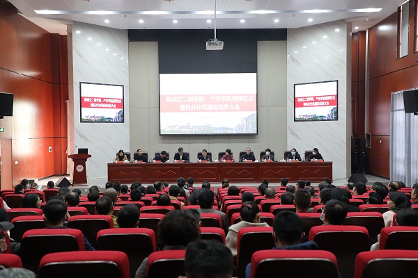 11月17日下午,我校在东方红校区双创楼报告厅召开新成立二级学院、产业学院授牌暨机关作风建设动员大会。全体校领导、职能部门副科级以上干部、二级学院副处级以上干部参加了会议。会议由校党委副书记李克勤主持。