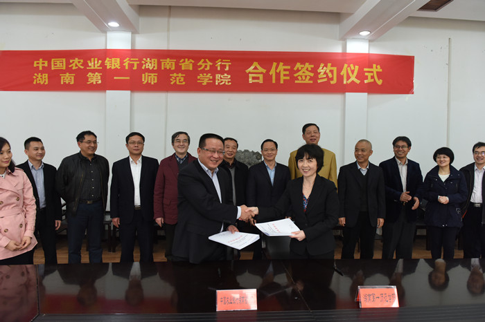 4月1日下午,我校与中国农业银行湖南省分行合作签约仪式在我校东方红校区行政办公楼会议室举行。中国农业银行湖南省分行陶伟梁副行长、周贫处长、周加良副处长,中国农业银行湖南省分行营业部徐源总经理、黄志光副总经理及相关职能处室、岳麓支行的主要负责人,我校校长童小娇、党委副书记刘志敏、副校长李克勤、副校长曹兴及党政办、资产处、财务处、现代教育技术中心负责人出席签约仪式。签约仪式由党委副书记刘志敏主持。