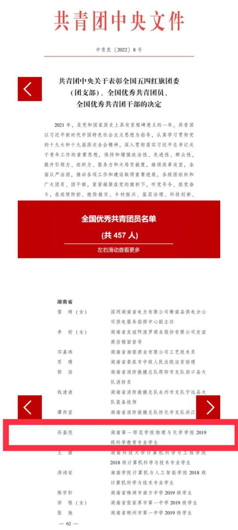 “全国优秀共青团员”是共青团中央授予团员的最高荣誉。本次评选中,全国共有457人获此荣誉,湖南高校仅3人。