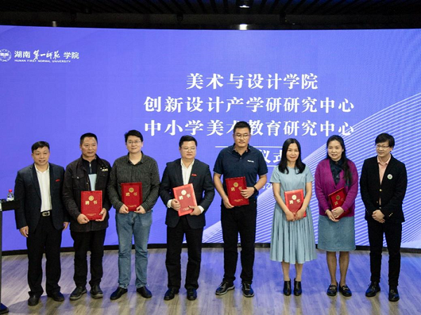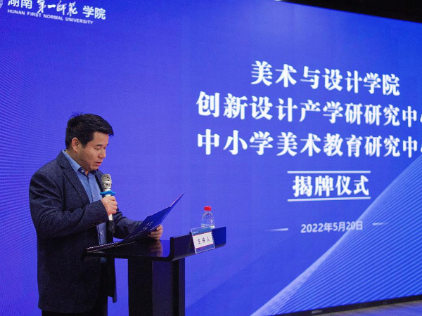 罗成翼为创新设计产学研研究中心、中小学美术教育研究中心揭牌,他指出,美术与设计学院一定要认真做实做优两个研究中心,把研究中心办得真正促进教学、促进科研、促进改革;一定要做到两个“牢牢把握”,牢牢把握基础教育主战场,师范专业立足湖南,辐射全国,服务城乡中小学教育;牢牢把握“强省会”主战场,非师范专业对接长沙,助力“长株潭”都市圈建设,服务区域经济社会发展。