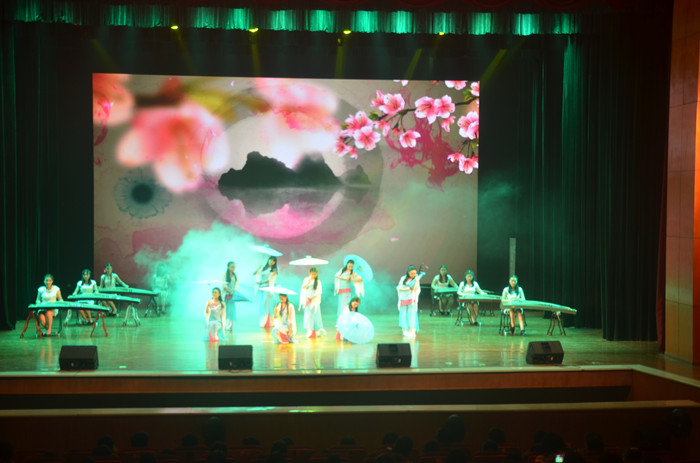 19时,文艺演出正式开始。开场节目《龙腾狮舞》描绘了一副宏大壮阔、催人奋进的奋进蓝图;朗诵《我的南方和北方》声情并茂地流露出强烈的爱国主义精神;现代舞dancing my soul and drop dead beautiful以艳丽惊人的舞姿点燃了观众的激情;器乐伴奏《美人吟》铺陈了雍容典雅、韵味悠长的图卷;小品《都是彩票惹的祸》和相声《两个男学长》主题鲜明、贴近生活、立意深远;三下乡情景剧《向上向善、飞扬青春》是晚会情感的制高点,再现了一师学子践行社会主义核心价值观,扎根基层、服务三农的场景,同时将满满的正能量传递给了在场每一位观众;歌伴舞《春风的话》、舞蹈《渐入佳境》、《给力青春》既表现出年轻学子对美好生活的热爱,又给人以青春无悔的感染力。