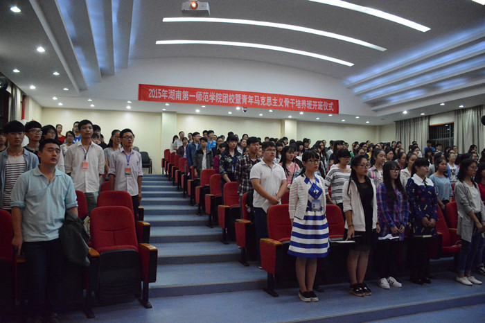 108,我校2015年团校暨青年马克思主义者骨干培养班开班仪式在东方红校区科技楼视频会议室隆重举行。校党委宣传部部长陈志武、校团委书记任晓晴出席了开班仪式。来自各二级学院的200多名学员参加了开班仪式。仪式由校团委杜毅老师主持。