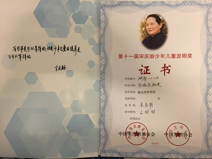 宋庆龄少年儿童发明奖是国家科技部批准的唯一以国家领导人的名字命名的青少年科技活动奖项,是面向在校中小学生开展的发明创造活动。发明奖的宗旨是实现宋庆龄主席“缔造未来”的伟大思想,培养中小学生创新精神和实践能力,提高中小学生的科学素质,推动我国科学技术的创新和发展。我校朱圣楠、朱元浩同学此次获奖,彰显了我校学生在发明创新上的实力和水平,激励着全校同学继续努力,争做新时代的创新型人才。