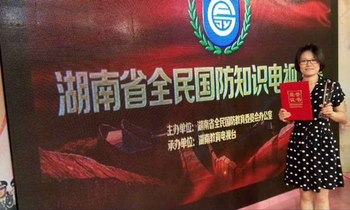 7月7日,在湖南省教育电视台举办的湖南省第一届全民国防知识电视大赛中,我校教育科学学院学生任婷代表长沙市与14个地州市同台竞技,经过激烈角逐,获得优胜奖。
