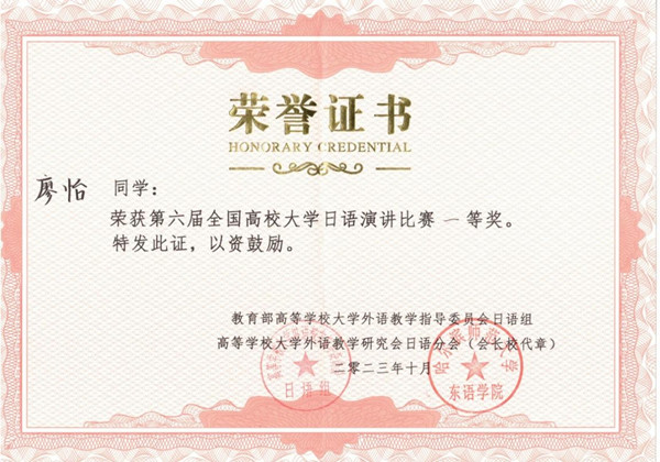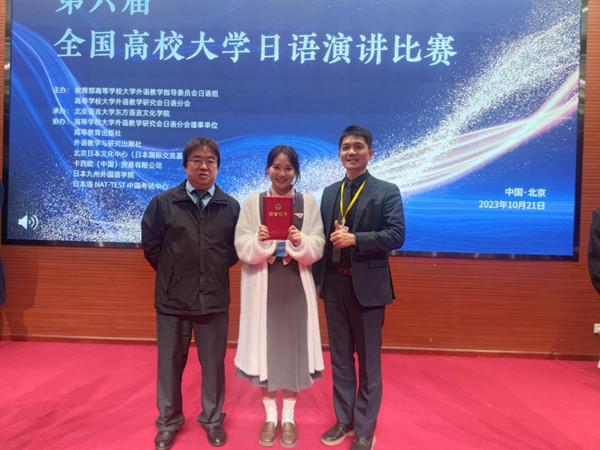 10月21日,第六届全国高校大学日语演讲比赛在北京语言大学落下帷幕。经过与来自复旦大学、北京师范大学、大连外国语大学等近百所高校参赛选手的激烈角逐,我校初等教育学院22级小学教育专业的廖怡同学最终获得全国一等奖,外国语学院教师刘锐、范晓露获优秀指导老师奖。