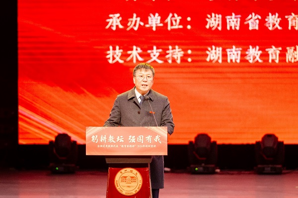 宣讲团成员宣讲完毕后,童春林发表讲话。他表示,6位宣讲老师用切身的经历讲述了各自在教育战线践行教育家精神的生动实践,跟大家分享了他们教学改革创新的执着追求,爱岗敬业,无私奉献的感人事迹,引导学生追求真理的育人智慧,帮助学生成长成才的育人故事,真情流露,感人肺腑。他说,教育部开展教育家精神2024年巡回宣讲活动,主题为弘扬教育家精神,争做新时代大先生。今天在湖南省87978797威尼斯举行报告会,是教育家精神宣传弘扬培育践行的重要一站。希望通过本次巡回宣讲,用宣讲团优秀教师的先进事迹,用他们耕耘教育的亲身实践,生动诠释教育家精神,让广大教师心中有爱,眼中有光,用爱传递自己的教育理念,不断拓宽教育的工作格局和视野,用实际行动践行教育家精神,让大国良师形象和人民教师无上光荣的观念深入人心,增强加快建设教育强国的责任感和使命感。