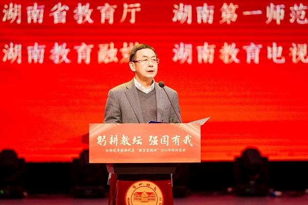 胡穗在致辞中表示,我校素有“千年学府、百年师范”美誉。2021年来,学校党代会擘画了“一四”发展战略,提出建设“特色鲜明的师范大学”和打造“四个一师”的战略目标和使命任务。学校主动对接“强师计划”,解放思想,改革创新,不断优化教师教育结构,全面深化人才培养改革,构建面向未来教师培养新体系,为教育强国和湖南基础教育扩优提质贡献更多“一师力量”。我校高度重视学习宣传贯彻教育家精神,第一时间组织教师和师范生进行学习研讨,成立教育家精神研究中心,开展系列活动,以教育家精神引领专家型教师队伍建设,以教育家精神培育师范生成长成才。学校将以这次教育家精神巡回宣讲学习为契机,进一步深入学习贯彻习近平新时代中国特色社会主义思想,深刻领会教育家精神的核心内涵和实践要求,把教育家精神内化为教书育人能力、教学方式方法,奋力投身教育强国建设的生动实践,为强国建设、民族复兴伟业作出新的更大贡献。