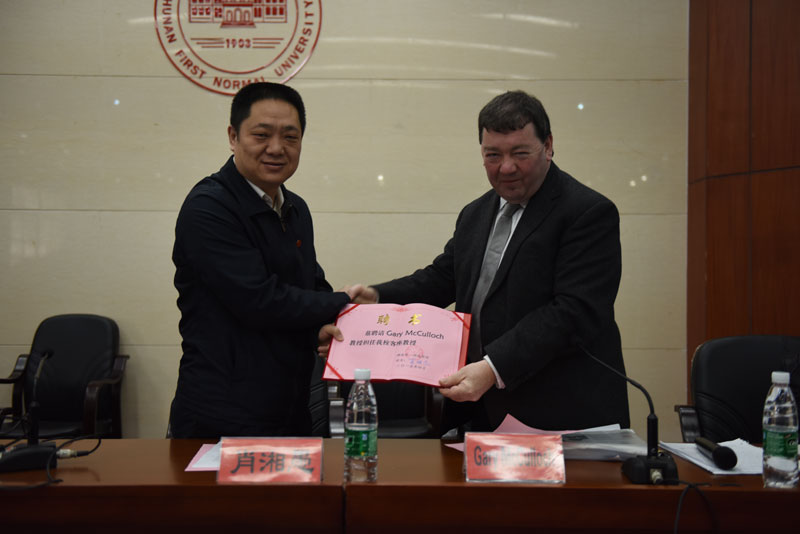 4月15日,英国社会科学院院士、伦敦大学教育学院人文与社会科学系主任Gary McCulloch教授应邀来我校讲学。我校在科技楼视频会议室隆重举行了Gary McCulloch教授客座教授聘任仪式暨学术报告会。校长肖湘愚、副校长童小娇及有关院部领导、教师与教育科学学院学生代表参加了此次活动。