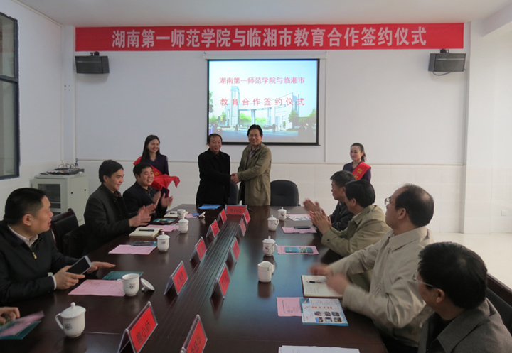 3月27日上午,校长肖湘愚,副校长刘志敏、童小娇带领教务处处长佘向军、现代教育技术中心主任朱承学、教务处副处长黄国盛、实践教学管理科科长李建亚等赴岳阳临湘市,与临湘市人民政府和临湘市教育局签署产学研合作教育协议。临湘市委副书记、市长龚卫国,市委副书记李伍华,市人大副主任曹小光,副市长刘如乐,市政协副主席李征雷,市教育局局长朱琼波等出席签约仪式。签约仪式由临湘市委副书记李伍华主持。