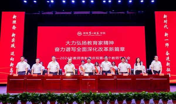 9月6日下午,我校在东方红校区田汉剧场隆重举行2024年教师表彰暨庆祝第40个教师节大会。校党委书记罗成翼发表讲话,校长胡穗主持大会。全体在家校领导、党委委员,退居二线的老领导,全体教职员工,离退休老同志代表,一、二附小教师代表及部分学生代表参加大会。