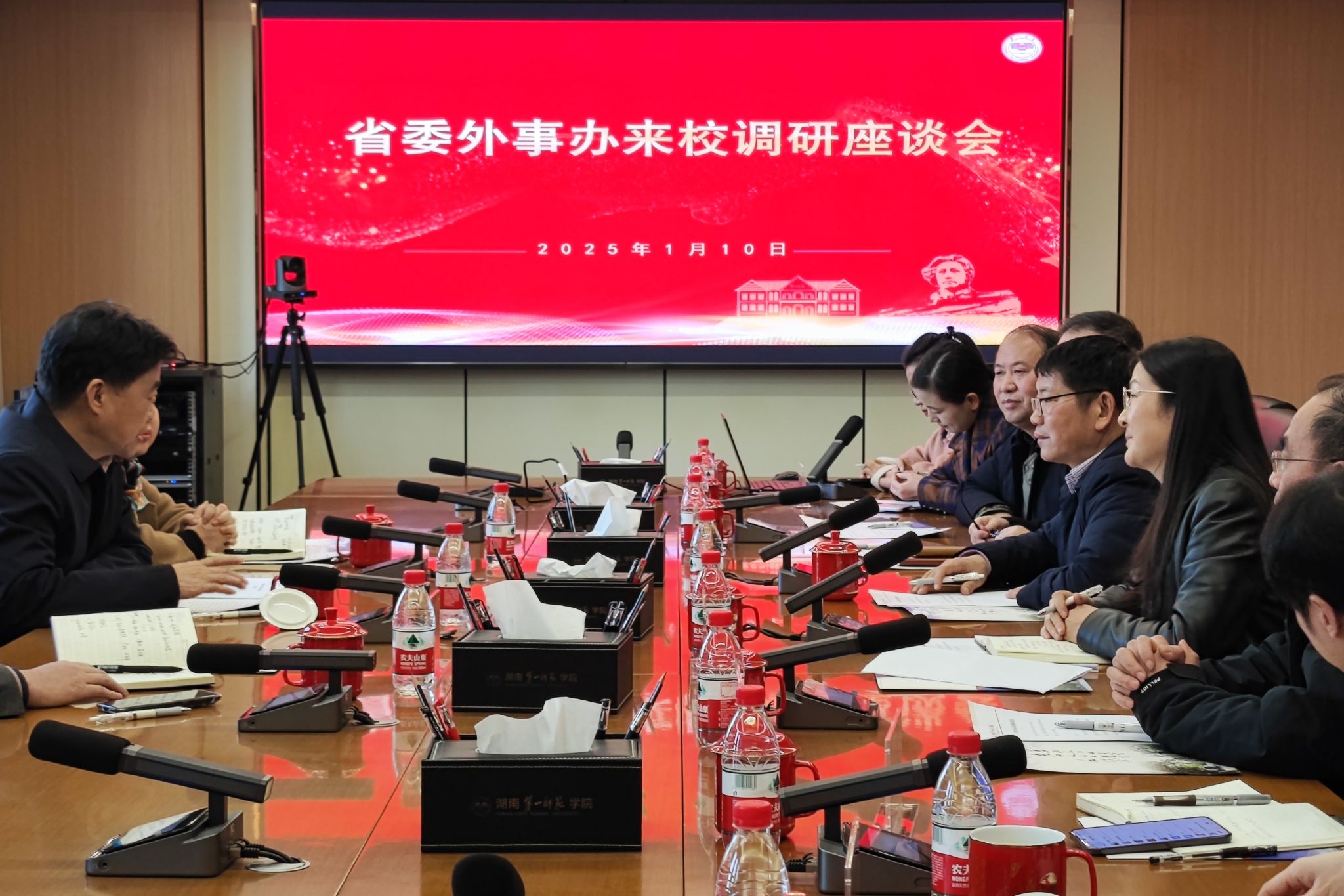 1月10日下午,中共湖南省委外事办一级巡视员邱爱华一行莅临我校,就书院文化传播工作开展调研。调研座谈会在百熙楼710会议室召开。校党委书记罗成翼,校党委委员、副校长蒋蓉出席会议。外国语学院、文学与新闻传播学院、音乐舞蹈学院、美术与设计学院、初等教育学院等相关部门负责人参加会议。会议由蒋蓉主持。