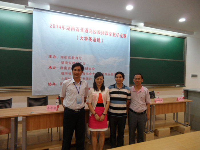 6月22日,2014年湖南省普通高校教师课堂教学竞赛大学英语组决赛在国防科技大学举行。我校公共外语教学部杜晓文老师在本次竞赛中荣获一等奖,并荣获“芙蓉百岗明星”称号,充分展示了我校大学英语教师的教学水平和风采。