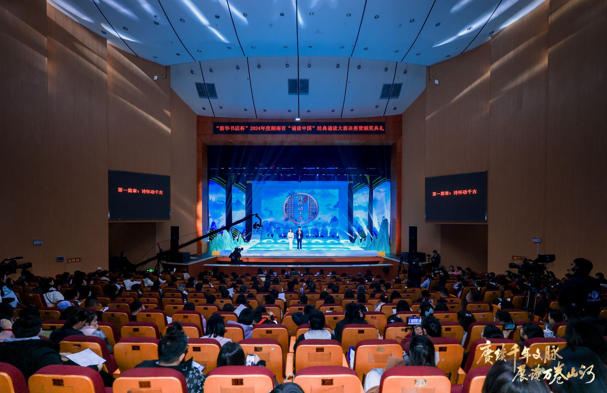 “新华书店杯”2024年度湖南省“诵读中国”经典诵读大赛决赛暨颁奖典礼以“赓续千年文脉,展读万卷山河”为主题,现场比赛分为“诗怀动千古”“赤胆映山河”“素心仰天地”“大道贯九州”四个篇章,14支代表队用激情的诵读、动人的情景演绎生动再现作品中主人翁的家国胸襟、生命与人文的哲思。