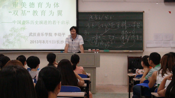 8月1日上午,中国律学学会副会长、武汉音乐学院副院长李幼平教授为学员们作了题为《审美德育为体、双基教育为翼——中国音乐历史演进的若干启示》的讲座。他通过大量音乐考古的一手资料,图文并茂地为学员们讲解中国传统音乐文化的历史,并就如何将这些传统音乐知识传授给小学生们提供了丰富的案例与方法,极大地开阔了学员的视野。