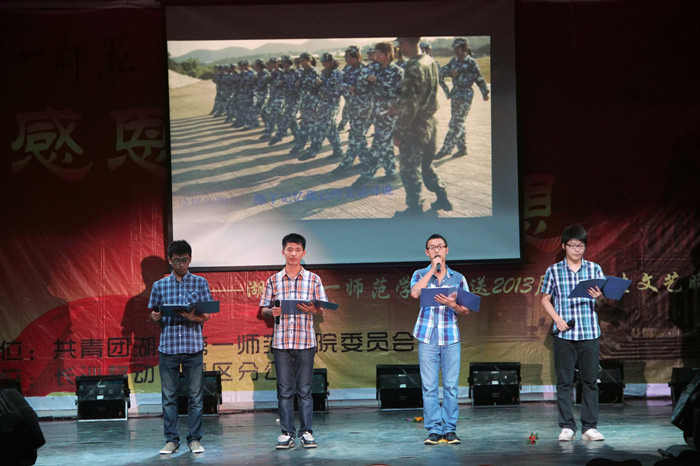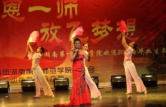 6月20号晚,由校团委主办的“感恩一师,放飞梦想”欢送2013届毕业生文艺汇演在科技演播厅隆重举行。校领导彭小奇、金潇明、阳柏苏、刘志敏、杨兰英,以及党委宣传部、学生处、公共实验管理中心、校团委、各系部党总支的领导和教师代表莅临现场与毕业生们一起观看了晚会。