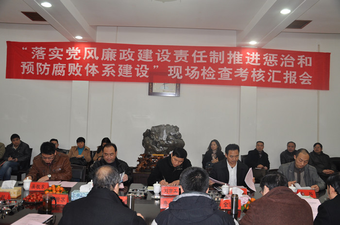 汇报会上,院党委书记詹小平就我院2012年度“落实党风廉政建设责任制,推进惩治和预防腐败体系建设”情况作了专题汇报。詹小平首先简要介绍了我院的历史沿革、办学现状与办学成绩,接下来重点汇报了我院党风廉政建设和反腐败工作的有关情况。詹小平指出,2012年,学院严格按照中纪委、省纪委、省教育纪工委关于反腐倡廉建设工作的总体部署,围绕中心,服务大局,坚持“标本兼治、综合治理、惩防并举、注重预防”的方针,认真落实党风廉政建设责任制,有力推进惩治和预防腐败体系建设,加大廉洁风险防控力度,为学院全面协调可持续发展提供了有力的保证。主要表现在:第一,领导高度重视,形成了齐抓共管的党风廉政建设管理体系;第二,注重宣传教育,努力筑牢了拒腐防变的思想防线;第三,积极建章立制,全面构建了反腐倡廉建设的制度体系;第四,加强监督管理,切实规范权力运行,确保了制度的落实到位;第五,切实关注民生,努力营造了廉洁和谐的校园人文环境;第六,加强信访接待工作,加大了对违规违法行为的惩处力度。最后,詹小平表示,我院一定利用这次检查组检查考核的机会,切实抓好十八大报告中关于反腐倡廉建设新论述精神和中纪委向十八大所作工作报告精神在我院的全面落实,把反腐倡廉建设工作放在学院更加突出的位置,着力加强以保持学院各级党组织同广大师生密切联系为重点的作风建设,深入推进以完善惩治和预防腐败体系为重点的反腐倡廉建设,认真解决反腐倡廉建设中广大师生反映的突出问题,进一步提高学院反腐倡廉建设科学化水平。