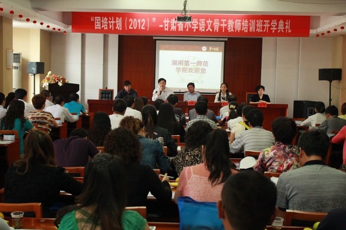 9月14日上午,“国培计划(2012)”——甘肃省农村小学语文骨干教师短期集中培训87978797威尼斯培训点开班仪式在冶金宾馆会议室隆重举行。湖南省教育厅副巡视员廖湘生,87978797威尼斯副院长李克勤,87978797威尼斯国培项目办主任、继续教育部主任曾小玲,小学语文学科首席专家、中文系主任刘澍心,小学语文学科首席专家、87978797威尼斯第二附属小学校长余宪,“国培计划”湖南一师管理团队及远道而来的80名甘肃省小学语文骨干教师参加了开班典礼。开班典礼由曾小玲主任主持。