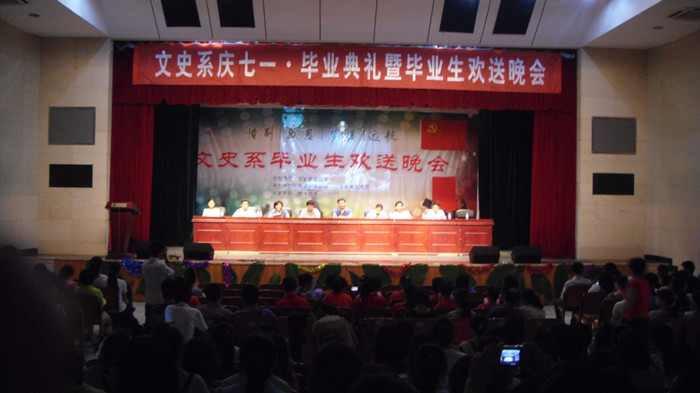 6月18日晚 ,文史系庆“七·一”、2012届毕业生毕业典礼暨毕业生欢送晚会在东方红校区科技楼演播厅隆重举行。系党总支副书记陈天涯主持了毕业典礼,院党委行政办公室主任江正云,宣传部部长陈志武,学生工作处处长何文,团委书记任晓晴,文史系党总支书记雷庆娥、主任刘澍心、邓绍秋副主任等领导及400余名师生出席毕业典礼并观看了晚会。