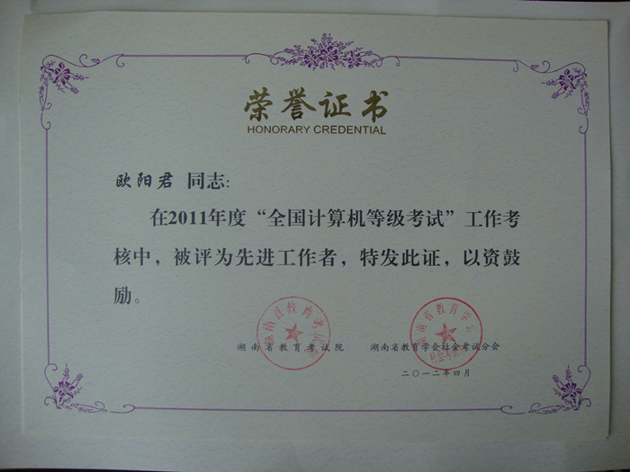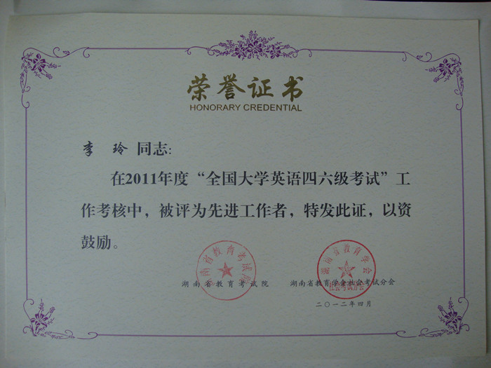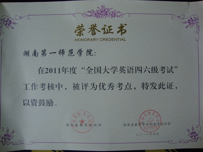 近日,湖南省教育考试院发文《关于表彰2011年度社会考试优秀考点和先进工作者的通报》(湘教考社字[2012]5号),我院被评为“全国大学英语四六级考试优秀考点”,李玲同志被评为“全国大学英语四六级考试先进工作者”,欧阳君同志被评为“全国计算机等级考试先进工作者”。