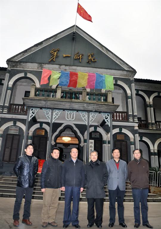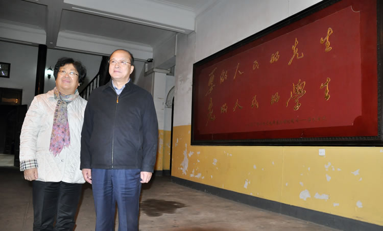 李长江一行饶有兴趣地参观了青年毛泽东纪念馆,进一步了解了成就一代伟人的第一师范。临走时还特地要求在前楼大厅毛泽东的“要做人民的先生,先做人民的学生”和徐特立的“实事求是,不自以为是”的题词前留影纪念。