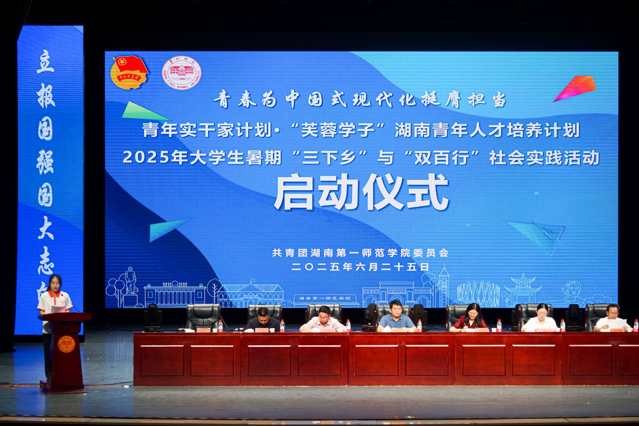 青春“湘”约实践路,红色学府启新程。6月24日上午,我校2025年暑期“三下乡”与“双百行”社会实践活动启动仪式在东方红校区田汉剧场举行。校党委书记罗成翼,校党委委员、副校长蒋蓉出席会议。拓维信息等校企合作单位代表、相关部门负责人、千名师生齐聚一堂,共同见证这一青春盛事。校团委副书记(主持工作)易利主持会议。