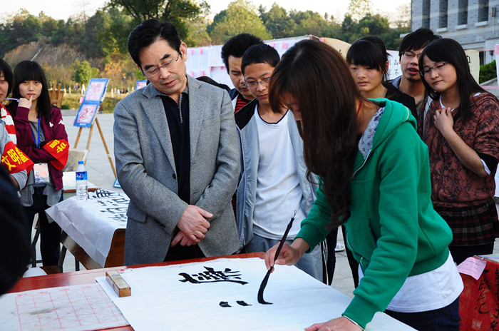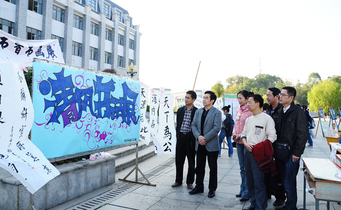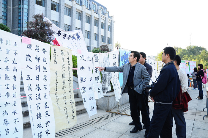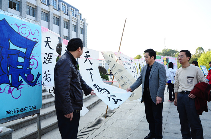 11月24日,由院团委、院纪委监察处共同主办的大学生“书香书画展”活动在东方红校区图书馆前坪隆重举行。院纪委书记阳柏苏,宣传部部长陈志武,党政办副主任彭晓辉,监察处副处长莫崇芬,团委书记任晓晴、副书记罗祥云以及相关部门负责人、教师代表应邀观看了展出。