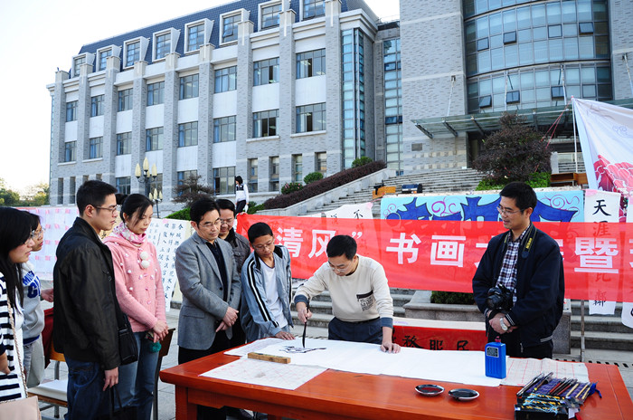 本次“书香书画展”活动共展出作品近300件,包括大学生“清风杯”书法大赛获奖作品157件。《廉洁公正》、《爱莲说》等一系列作品行笔流畅、舒展自如,既体现了中华书法的神韵,又生动形象地呈现了中华民族刚正不阿的浩然正气。水墨画《墨润山色泉有声》意境优美;剪纸《迎春纳福》巧妙展现了中国传统民间特色;此外,呼之欲出的《印象江南》刮画,惟妙惟肖的素描《八骏图》和油画《淡湖夕阳》则表现了作者深厚的艺术功底和丰富的想象力。活动现场,部分领导、老师和学生代表还轮流进行了即兴创作,赢得了在场观众的阵阵掌声。