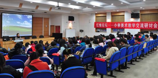 10月27号下午,由我院教育科学系与长沙市教育科学研究所共同主办的“红烛论坛:小学美术教学交流研讨会”在城南书院校区隆重举行。教育科学系艺术教研室教师、长沙市200多名美术教师以及教科系100多名学生对当前小学美术教育教学进行了交流研讨。我院教科系主任蒋蓉、副书记袁向荣,湖南师范大学美术学院美术教育研究所所长谢雱教授、副所长冯晓阳副教授、长沙市科学研究所美术教研员宋子正高级讲师、芙蓉区教研员彭海鳌、雨花区教研员何嘉僖、开福区教研员罗炜、天心区教研员邓军、岳麓区教研员杨群芳参加了研讨会。