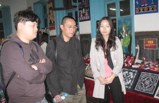 湖南师范大学美术学院美术教育研究所所长谢雱教授(中)在姚英老师的陪同下观看展览