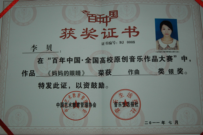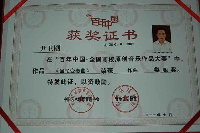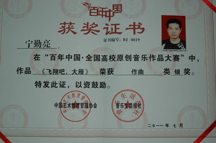 7月28日,“百年中国•全国高校原创音乐作品大赛”在北京举办。我院音乐系宁勤亮老师,音乐系08级尹卫刚、李贝两位同学的参赛作品经过初赛和决赛从中脱颖而出,其中,宁勤亮老师的男声四重唱作品《飞翔吧,大雁》获教师组银奖;尹卫刚钢琴作品《回忆变奏曲》及李贝同学声乐作品《妈妈的眼泪》均获得学生组银奖。